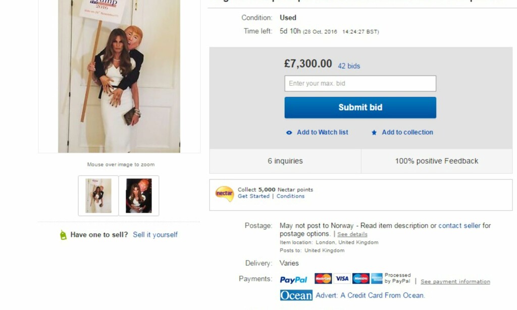 Nå er Trumps påståtte klåing blitt et Halloween-kostyme til salgs på nettet. «Original Trump Groper» ble til etter idé fra journalist Jemima Goldsmith, og originalen kan bli din for rundt 73 000 kroner i skrivende stund. Det er fortsatt fem dager igjen av nettauksjonen.