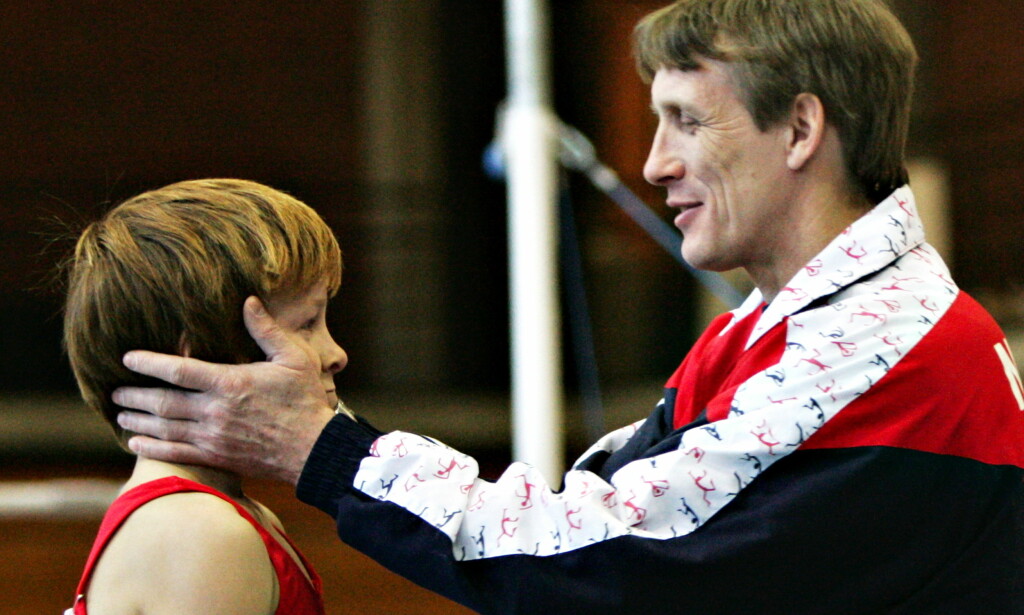 TRENER OG ELEV: Stian Skjerahaug blir gratulert av trener Vyacheslav “Slava” Strokin under landsfinalen i turn i 2005, der Dagbladet var tilstede. Foto: Erik Berglund
