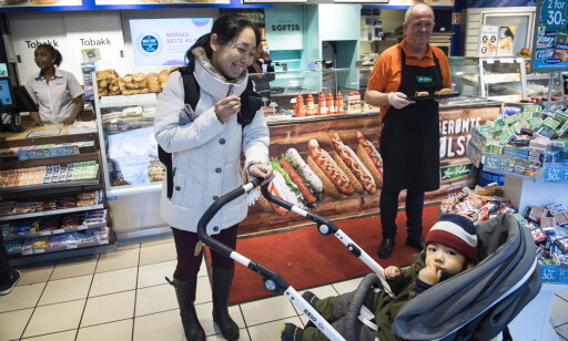 POSITIVE: Leon (2) og mamma Masayo Thorén vendte tommelen opp for veganpølser da de fikk testet dem i kiosken i høst. Foto: Lars Eivind Bones Vis mer