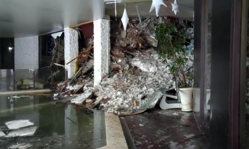 KORRIDOREN: Store mengder snø og vrakgods fyller hotellkorridoren. Foto: Politiet / AP / NTB Scanpix